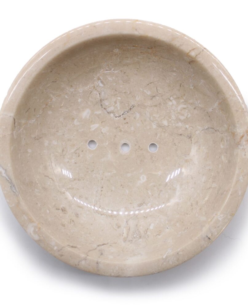 Unique decorative round marble soap dish made of honey marble. The smooth inner part emphasizes the naturalness of the stone. Holes in the bottom make it easier to dry the soap and keep it in good condition.