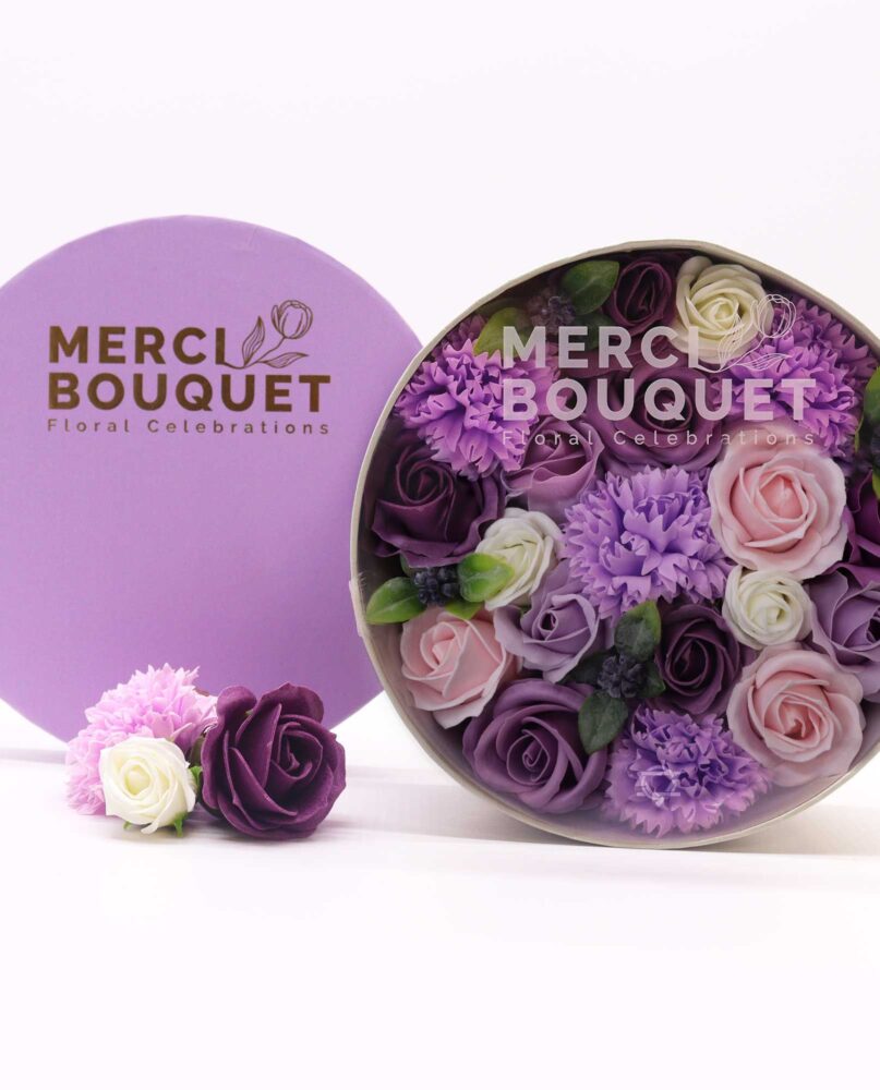 Spoil your customers with the opulence of purple and the beauty of roses and carnations. Our Soap Flower Gift Round Box in Purple Rose & Carnation is a statement of refined taste and affection.