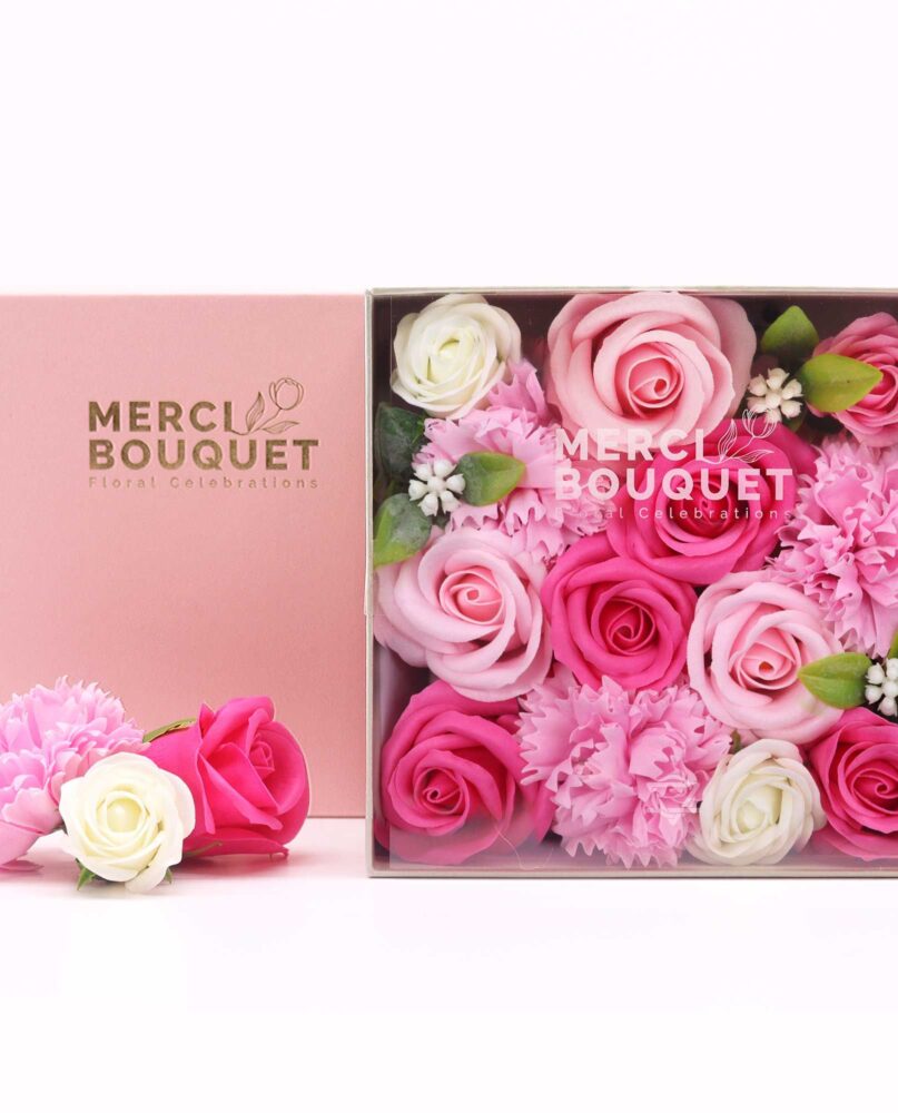 🌼 Floral Elegance: Inside the square box, you'll find delicate soap flowers crafted with care, including roses and other floral accents that add a touch of grace.