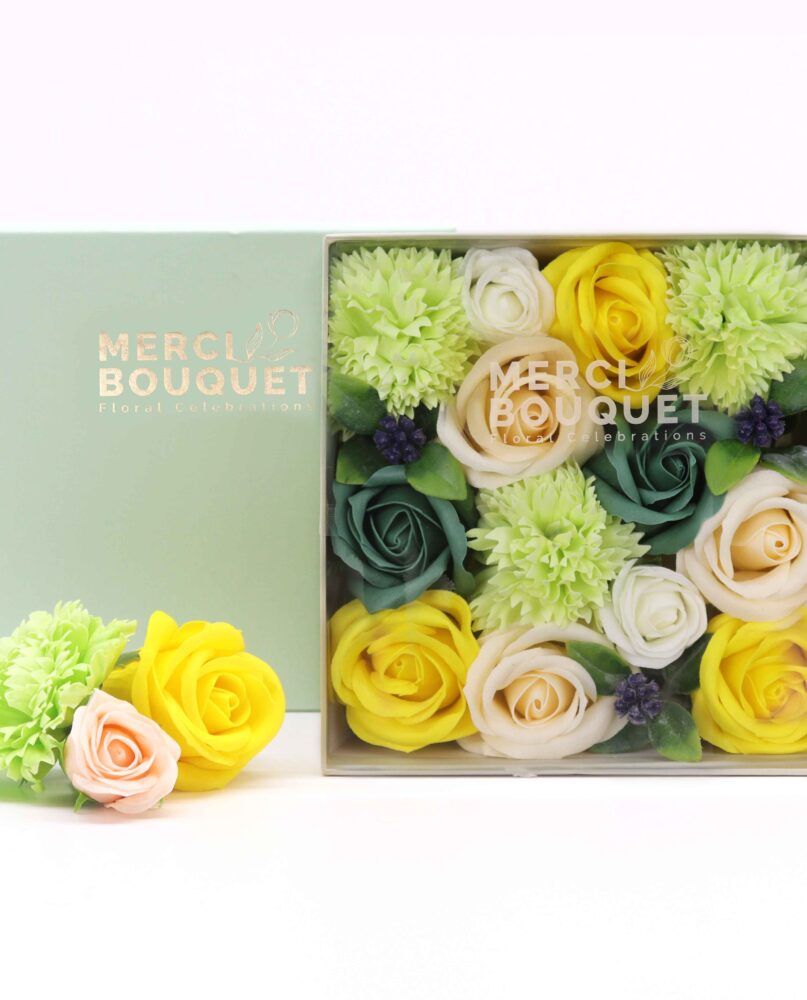 🌼 Blooming Beauty: Inside the square box, you'll discover a stunning array of handcrafted soap flowers in cheerful shades of yellow and lush greens, resembling a blossoming spring garden.