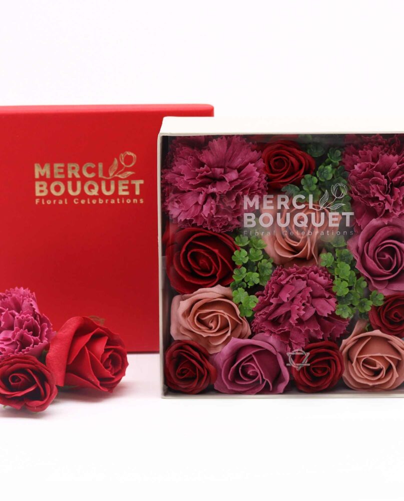 🌷 Royal Splendour: Inside the square box, you'll find a stunning ensemble of handcrafted soap flowers, showcasing purple roses and charming carnations.