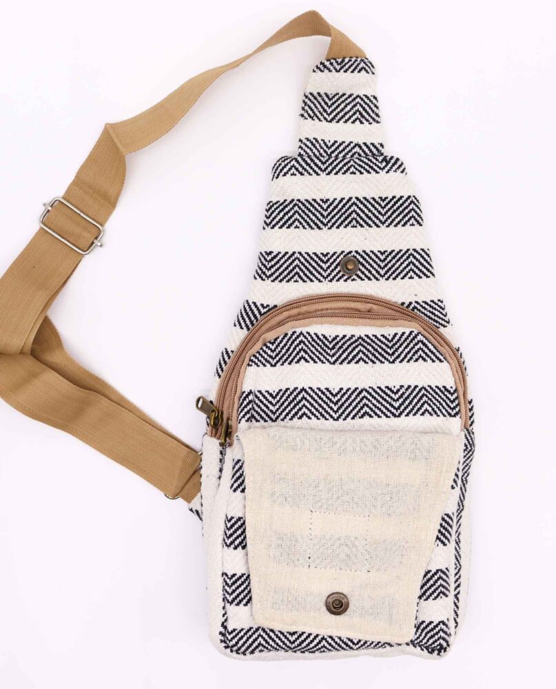 This body cross bag, crafted from natural cotton in a striking black & white colourway, blends urban edge with eco-conscious materials. Featuring a versatile and durable nylon strap, it offers both style and practicality for the fashion-forward individual who values sustainability.