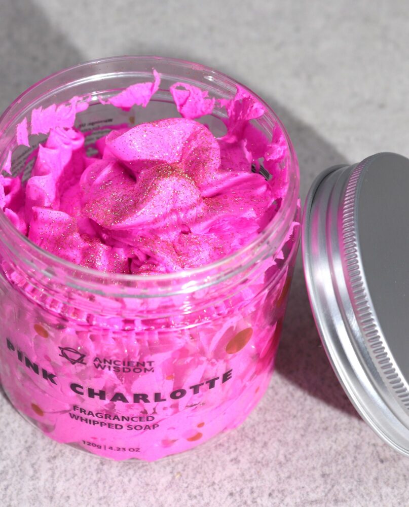 Pink Charlotte Whipped Soap combines a rich, whipped texture with nourishing cleansing properties, leaving the skin feeling soft, smooth, and lightly moisturised. Its gentle formula is suitable for all skin types and ideal for daily use or inclusion in self-care gift sets.E
