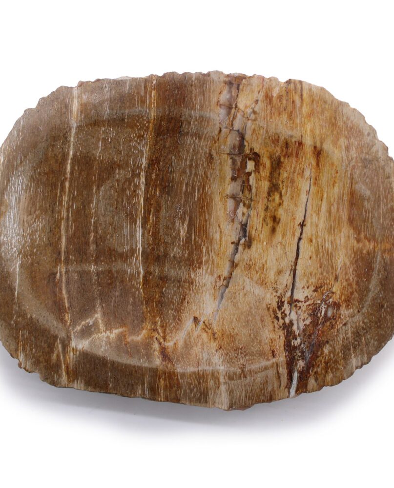 Soap dish made of petrified wood. The colour of petrified wood does not result from the tree species or the colour of the wood of a living plant, but is due to the presence of minerals that have penetrated into the silica mineralizing the debris. The upper part of this soap dish has been smoothly polished, the edges are left raw.