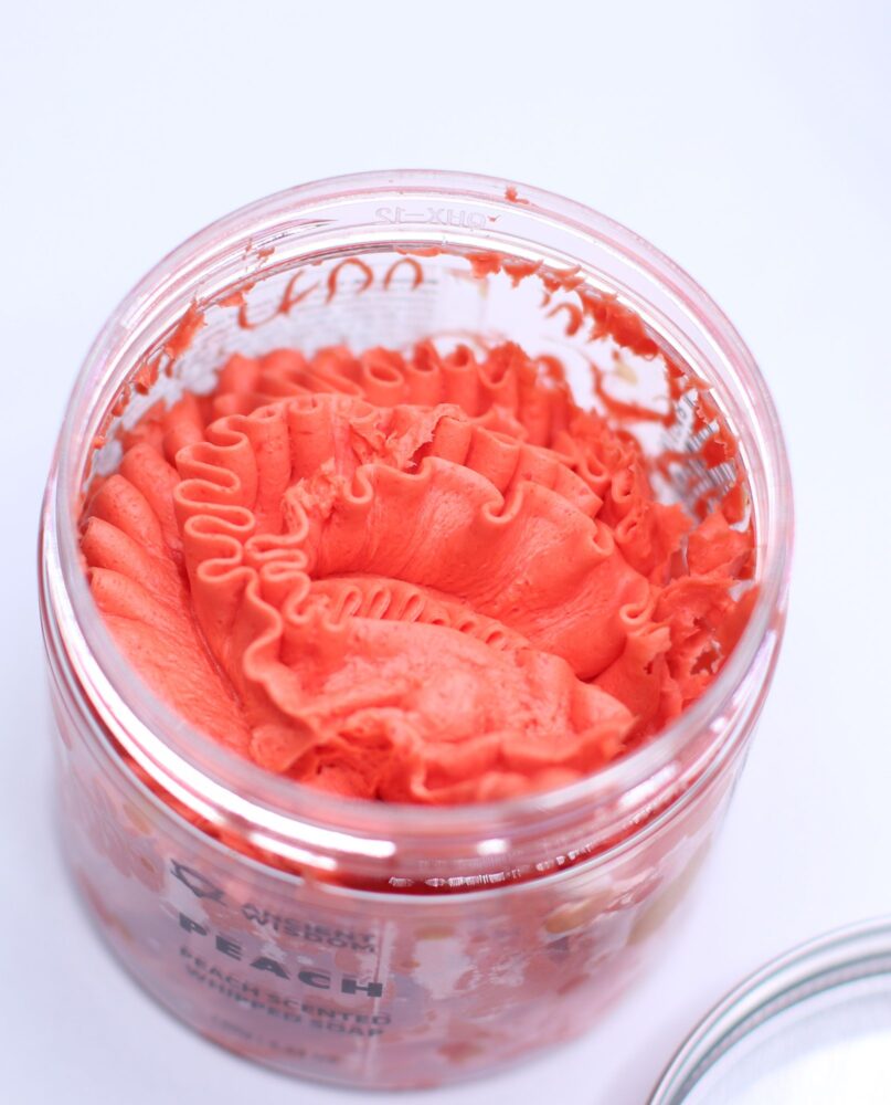 A bright, peach-scented whipped soap with a soft, fluffy texture that feels instantly refreshing on the skin. Its vibrant coral swirl looks uplifting in the jar and creates a smooth, creamy lather with every wash.