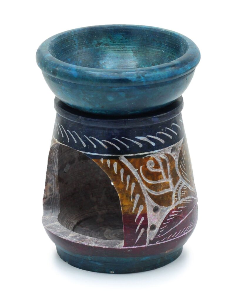 Bring a touch of nature to your aromatherapy sessions with this soapstone oil burner. Featuring a beautiful floral motif, this small oil burner is a work of art, made in India using natural soapstone. The burner showcases a unique combination of deep, rich colours, including striking blues and earthy browns, making each piece truly one-of-a-kind. With its compact size and stunning design, it’s perfect for diffusing essential oils or wax melts, creating a calming and inviting atmosphere in any space.