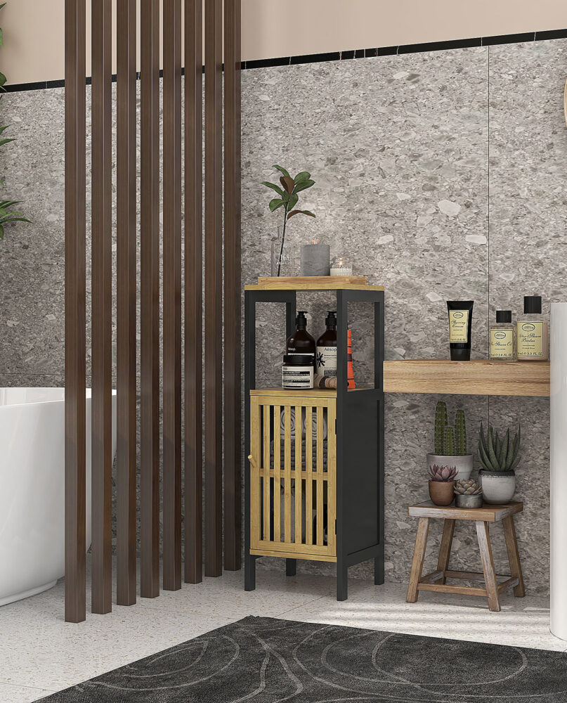 Retro charm for your bathroom, merged with adjustable storage. This slim storage cabinet combines a bottom cupboard and two upper shelves. Inside the cupboard there is a three-position adjustable shelf, so you can set it to the position you want. Made from a bamboo blend, this bathroom storage unit is a reliable piece, suitable for…
