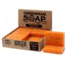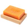 Soap slices are sold wrapped in waxed paper with an ingredients label and weigh approximately 100g.