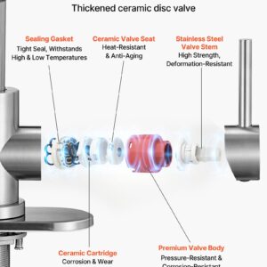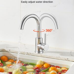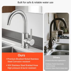 Features & Details High Reach Design: Designed for convenience, this rv kitchen faucet replacement offers a 360° rotating spout, providing full coverage for double sinks. The high-arc spout makes it easy to clean large pots without effort, reducing strain while ensuring a smooth water flow Anti-Splash Design: Equipped with a high-density aerator, this single handle sink faucet delivers a rich, bubble-filled water flow that reduces splashing during dishwashing. The splash-resistant design minimizes water on your sleeves and countertop, saving time on cleaning and keeping your workspace tidy Premium Stainless Steel: VEVOR sink faucet kitchen features a 304 stainless steel braided inlet hose, reducing the risk of leaks and bursts. The body and key components are also made from 304 stainless steel, offering excellent resistance to corrosion and acids, making it suitable for various water environments Push-Button Drain: Equipped with a push-button drain, our single handle kitchen faucet makes it easy to switch between filling and draining your sink. The integrated mesh filter traps debris, enhancing convenience and ensuring efficient drainage, making it a great addition to your kitchen setup Easy Installation: This brushed nickel kitchen faucet comes with a complete set of accessories, including the faucet, hot and cold water hoses, drain, base plate, and hex wrench, making installation quick and easy. No additional parts are needed, allowing even beginners to install it effortlessly