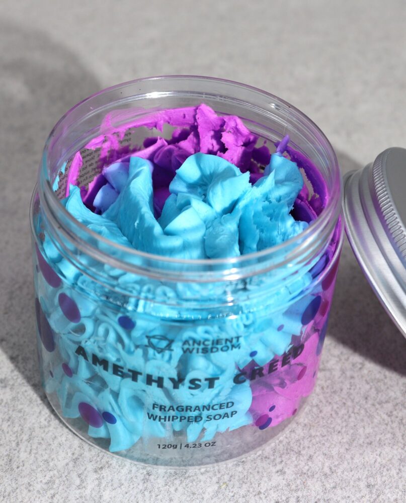 Amethyst Creed Whipped Soap delivers gentle yet effective cleansing in a rich, airy texture that leaves the skin feeling refreshed, soft, and lightly moisturised. Ideal for daily use, the whipped formula creates a creamy lather that cleanses without drying, making it suitable for all skin types.