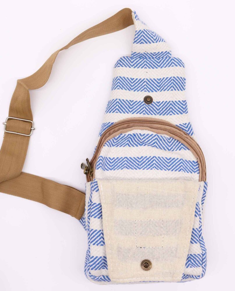 This refreshing body cross bag, crafted from natural cotton in a blue & white colourway, evokes nautical vibes with eco-conscious materials. Featuring a versatile and durable nylon strap, it offers both style and functionality for the fashion-conscious individual who appreciates a touch of coastal charm.