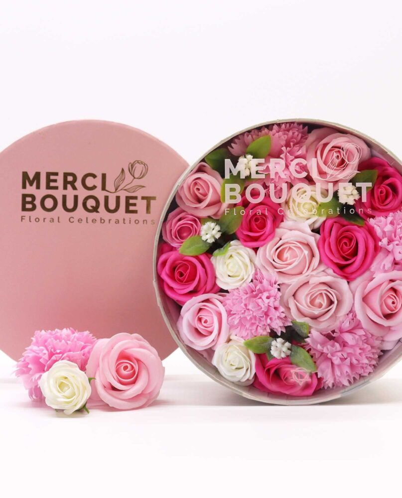 Soap Flowers Round Gift Box, a true embodiment of elegance and charm, in the delightful "Baby Blessings – Pinks" collection. These meticulously handcrafted soap flowers are a testament to the artistry and craftsmanship that goes into each petal.