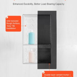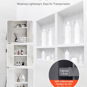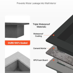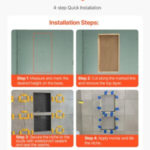 Features & Details Sealed and Waterproof: The insert shower niche uses a triple-layer waterproof base of XPS foam board, cement mortar, and waterproof coating, ensuring 100% sealing. It safeguards walls from wet and humidity, extending their lifespan and avoiding water penetration, keeping interiors dry and hygienic. Note: This product needs to be used in conjunction with waterproofing materials, not on its own!!!! High-Quality Materials: Made from (HCFC-free) XPS foam board, this niche offers exceptional durability, decomposition-resistant and decay-proof. Additionally, XPS foam is lightweight, easy to handle, and place. Multiple Craftsmanship: The surface features a double layer of cement mortar reinforced with fiberglass mesh, offering superior rigidity and load-bearing capacity, withstanding up to 62kg/m² (about the weight of an adult). The fiberglass mesh, cement mortar, and waterproof coating create a rough, textured surface that is compatible with any tile adhesive for strong adhesion and secure tiling. Easy Installation: Comes with an accessory kit for horizontal or vertical recessed installation. Just follow these steps: Step 1: Determine the required height and draw a horizontal line on the base layer. Step 2: Cut along the line and get rid of the top base layer. Step 3: Use waterproof sealant to attach the niche to the studs and seal the joints. Step 4: Apply mortar and affix chosen tiles. Wide Application: With a four-layer design, the overall dimensions are 4 x 16 x 24 inches + 4 x 16 x 24 inches (10.2 x 40.6 x 61 cm + 10.2 x 40.6 x 61 cm). The shower box occupies no extra building space and is convenient to use. Suitable for bathrooms, cabinets, bookshelves, kitchens, and more, meeting a variety of niche usage needs in different scenarios.
