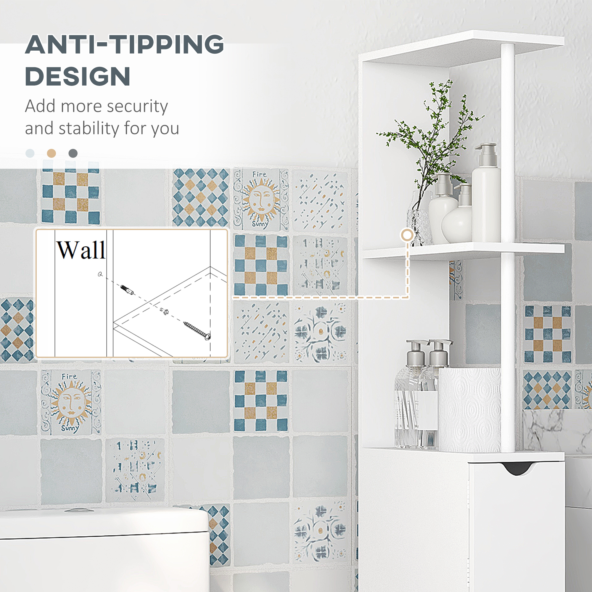 Tall, narrow and stylish – what’s not to love about this bathroom cabinet. Providing handy storage in a slim design, this piece is suitable for smaller spaces – bringing you storage into even the smallest spots. Comes with two top shelves (great for towels), small cupboard and two bottom drawers (great for hygiene and cleaning products). Comes with anti-tipping straps to attach to a wall for safety.